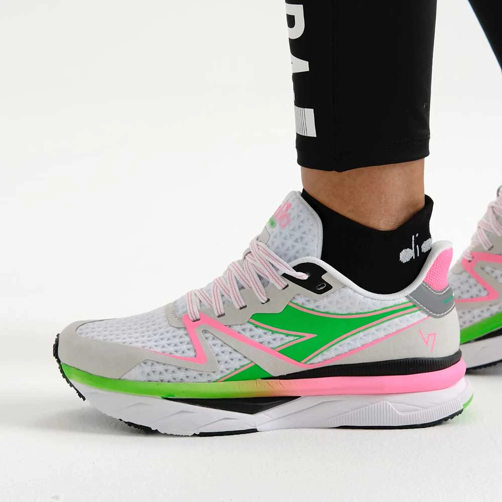 The Atomo V7000 stands out with its responsiveness and lightweight. The made-in-Italy “equipe atomo ” project is the utmost expression of the Diadora brand’s uniqueness in a max cushion, lightweight, neutral trainer.